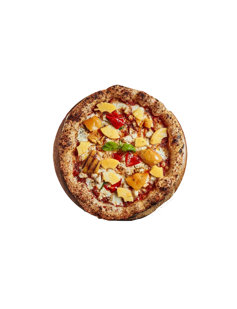 Sauce tomate, mozza, émincés de poulet mariné, poivrons, ananas